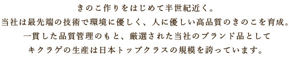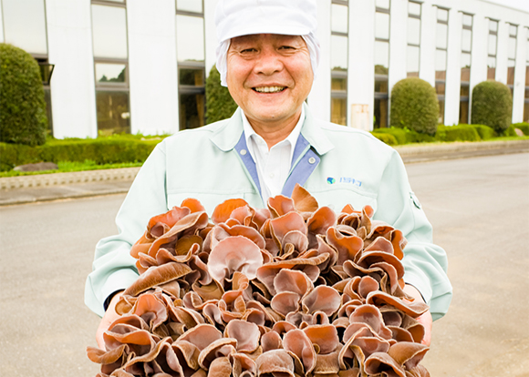 現在、キクラゲの国内消費量に対する国内生産量は、1%にも満たない現状であり、流通しているキクラゲの99%は中国から輸入されている乾燥キクラゲです。茨城県で長年、きのこ作りを生業としてきた弊社にとって、食の安全が第一にあるにも拘らず、中国から乾燥キクラゲが20年間も定量輸入させていることを重く受け止め、国産にシフトさせていかなければならないと決意し、生キクラゲの栽培研究を始めました。現在では、ビンを使用した高速キクラゲ栽培技術の特許も取得し、通年栽培により、年間を通して安定した供給が可能です。まだまだ流通量は少ないですが、国産の高品質で安全な生キクラゲを世に出していきたいという強い使命感を持って、食の安全に貢献していきたいと考えております