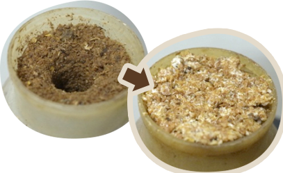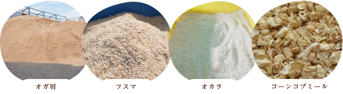 原材料はオガ屑を主にフスマ、オカラ、コーンコブミールです。