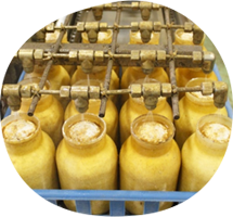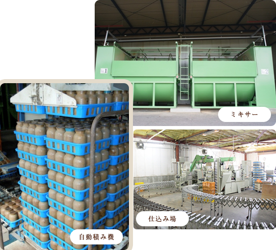 原材料をミキサーで十分に攪拌し均一にしたものを培地詰め込み機で850ccビンに充填し、キャップを付けて自動積み機で重ね次の工程へと移ります。