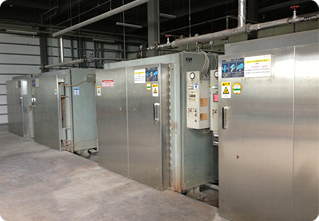 仕込み作業の次は殺菌工程です。培地を充填したビンを殺菌釜内へ移動します。この工程は昇温、ならし炊き、殺菌、蒸らし、脱気の5つの工程区に分けられ約6時間かけて行います。培地を殺菌するとともにきのこの菌糸が伸長(成長)しやすい 培地へと変化をさせる意味もあり、非常に重要な工程です。殺菌された培地は稙菌適温にする為に冷却機のあるクリーンルーム(放冷室)へ移動し培地温度が20度以下に下がるのを待ちます。殺菌釜の運転から放冷終了まで約1日かかります。